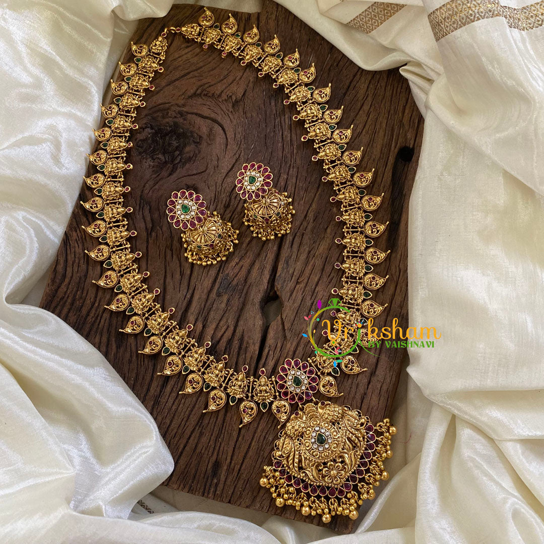 Premium Antique Temple Maanga Haram-Lakshmi haram-Intricately Designed Temple Neckpiece ad stone ; lakshmi idol along the length; comes with matching ear earrings.