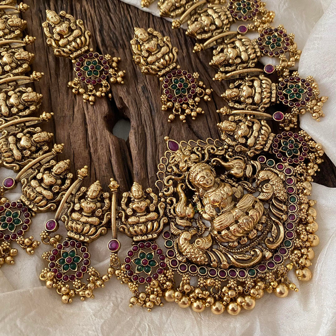 This antique temple pendant features a stunning Lakshmi dual peacock and dual elephant design, adorned with red and green stones. The finishing touch of ghungroos adds an elegant touch to this long Lakshmi Haram. Perfect for adding a touch of traditional charm to any outfit.