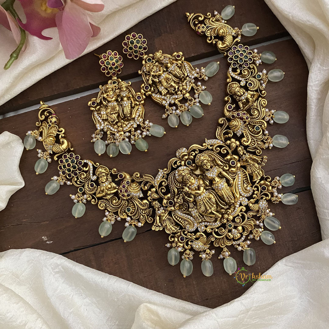 Discover the exquisite beauty of our Antique Temple Short Neckpiece, adorned with stunning aqua green beads and featuring a delicate radha krishna peacock design. Elevate your style with this luxurious and exclusive piece, inspired by the world of art and fashion. Comes with matching earrings.