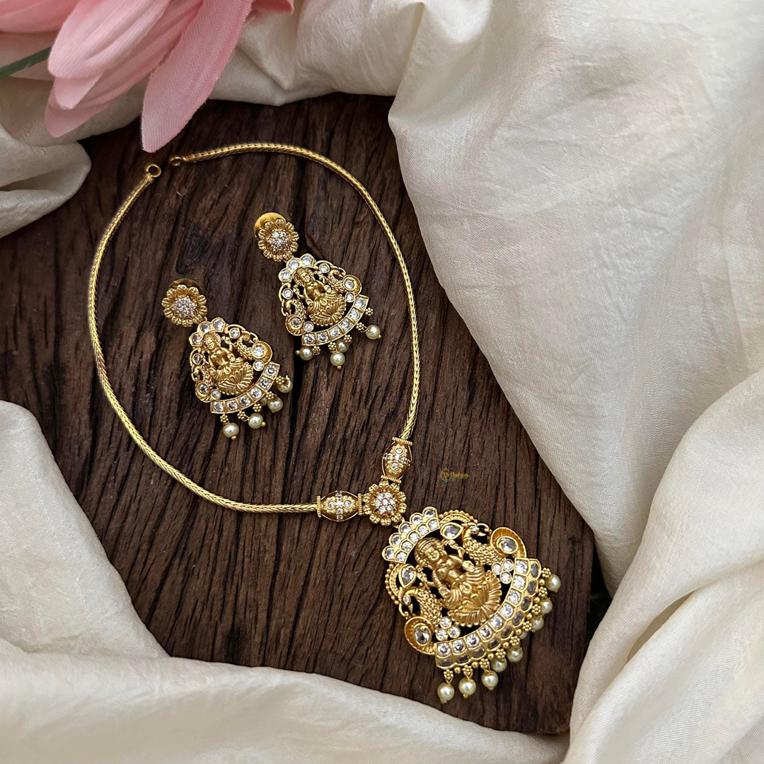 Elevate your style with our Antique White AD Stone Lakshmi Pendant Addigai-Pearl set! Featuring an intricately designed Lakshmi pendant and matching studs, this set exudes timeless elegance and adds a touch of traditional charm. Adorn yourself with this stunning piece and exude confidence and grace.