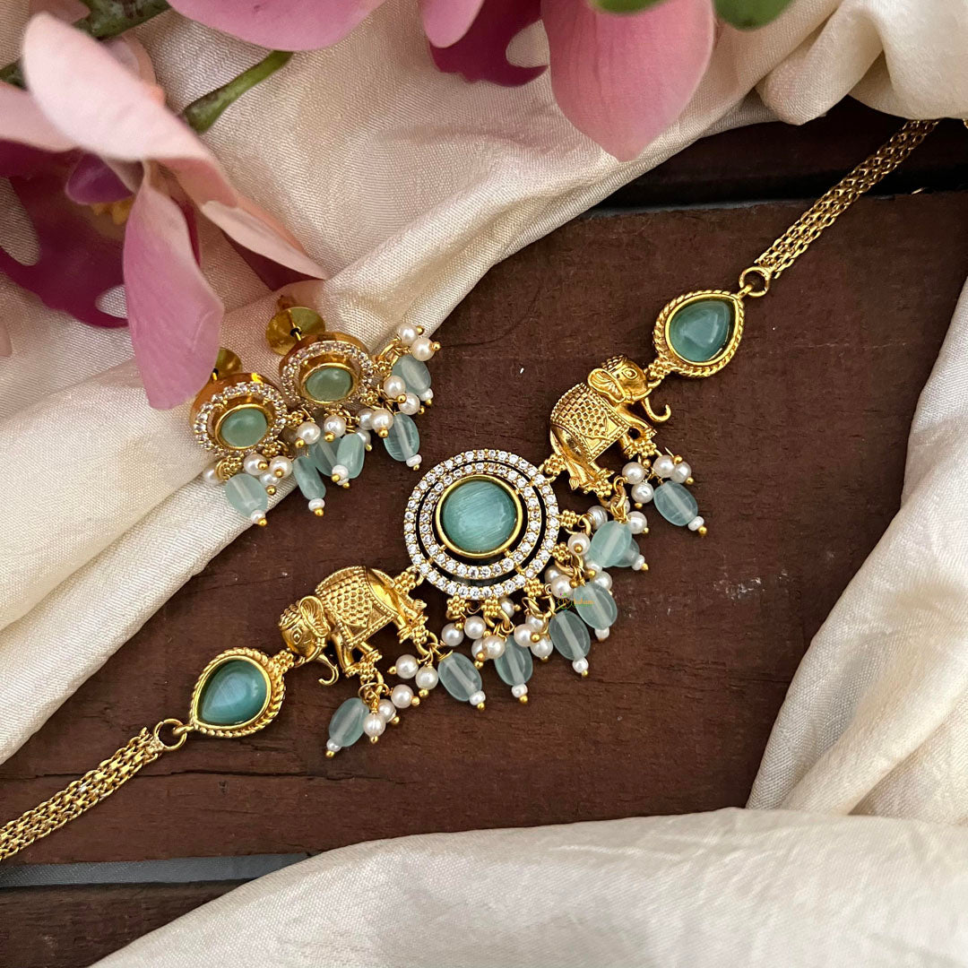 Aqua Green AD Stone Elephant Choker Neckpiece-Pearl-G12846
