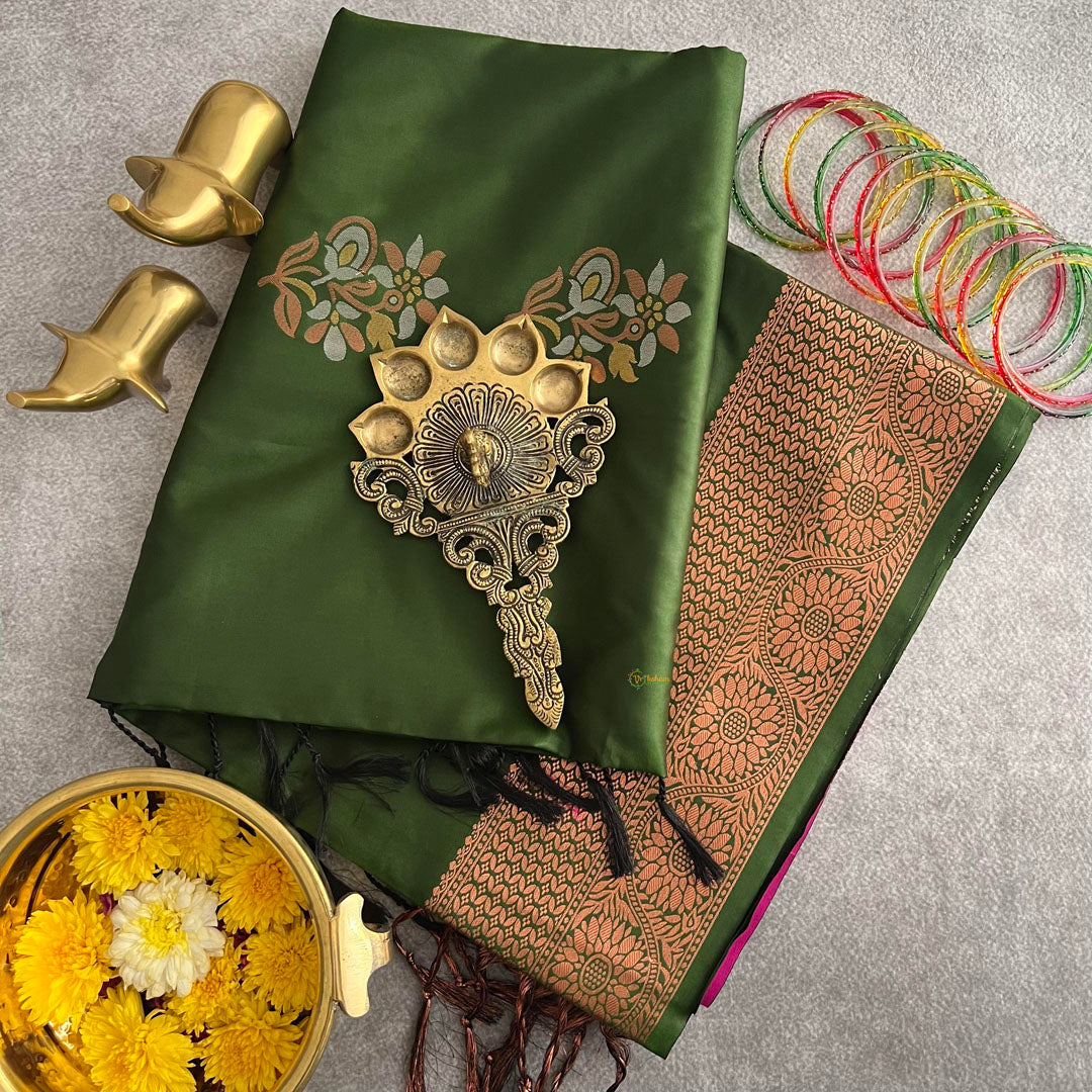Indulge in the luxurious charm of our Army Green Soft Silk Saree-VS3951. The delicate silk fabric drapes beautifully, while the hot pink pallu tassels add a touch of vibrance. Adorned with intricate copper zari work, this saree is a masterpiece of elegance and style. Elevate your wardrobe with this exclusive saree.