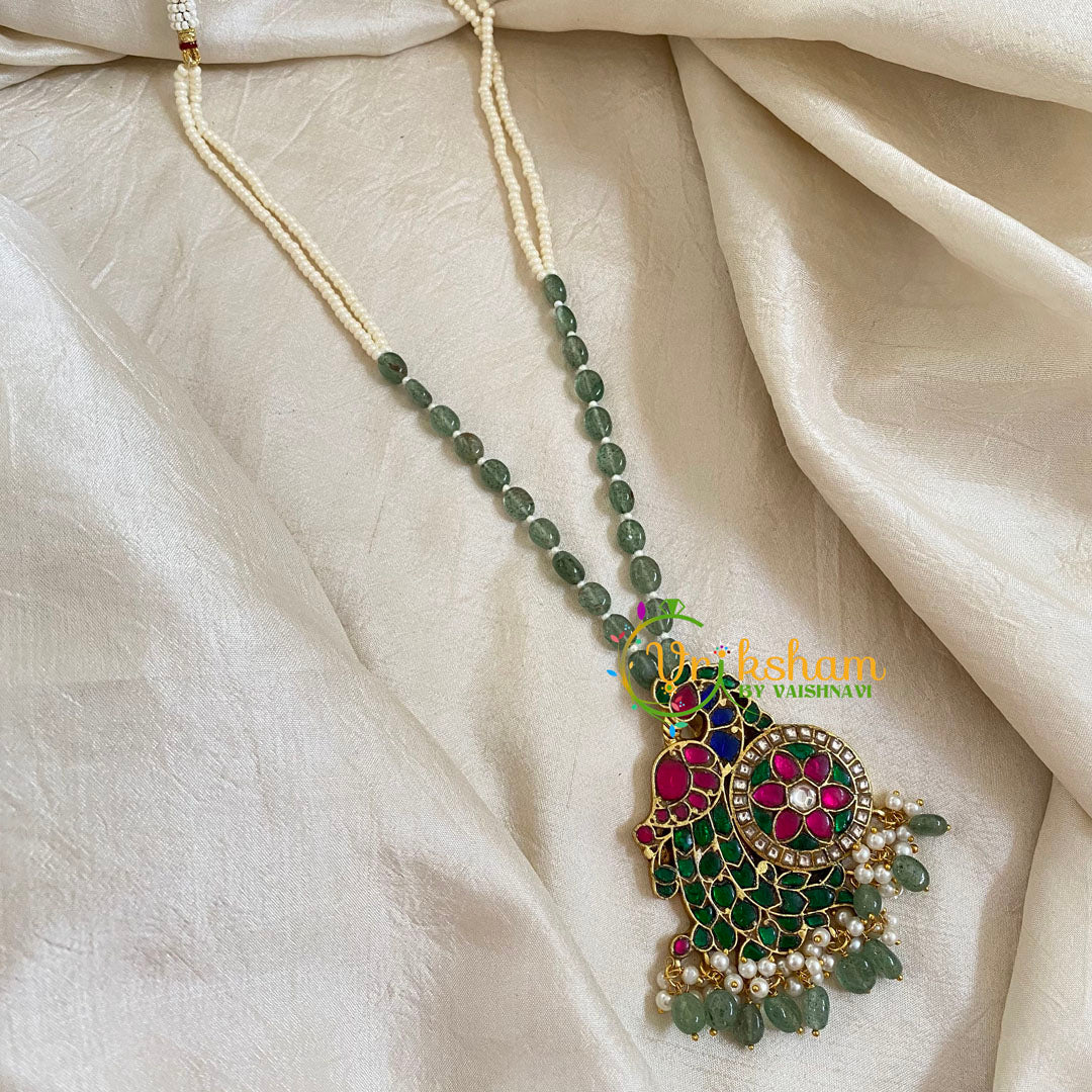 Green and White Bead Jadau Kundan Pendant Mala -J1655