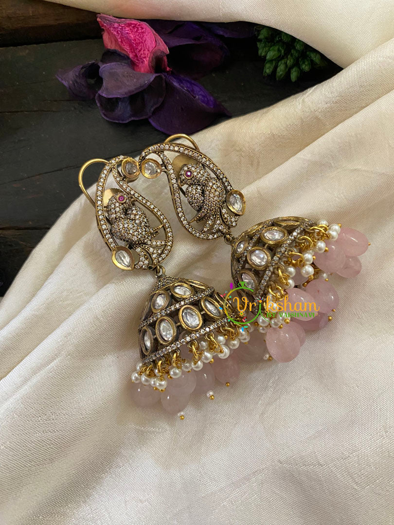 Pastel Pink Bead Victorian Diamond Jhumkas -Parrot inside paisley stud – stone set stud part; pearl and bead finish jhumkas.
