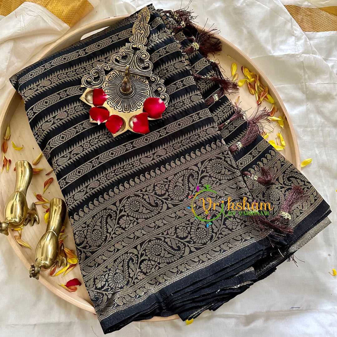 Black Georgette Saree – Festive wear saree – Veldhari lines work throughout the saree; comes with Blouse attached. Thread work two side traditional border.