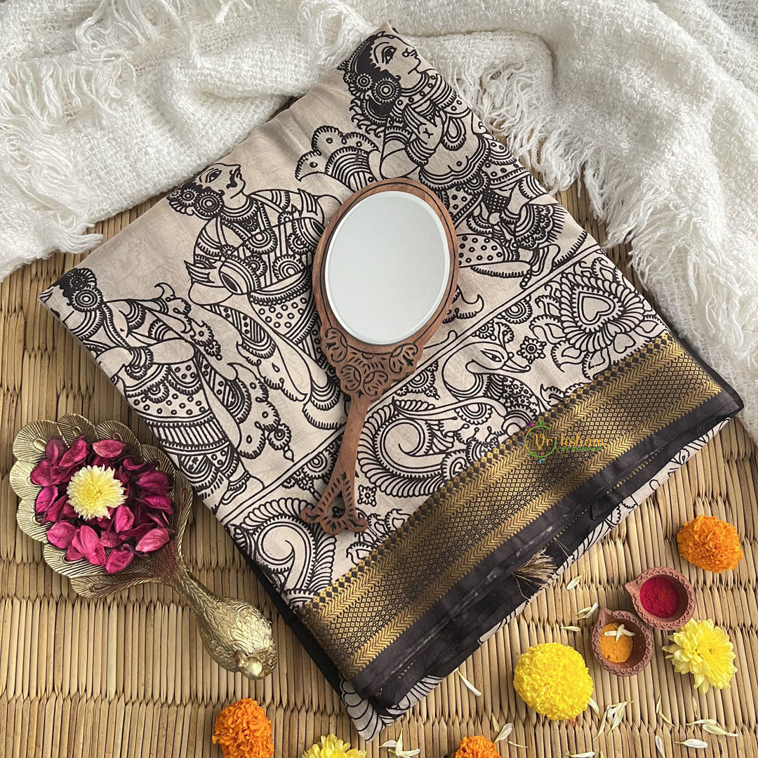 Indulge in luxury with our Black Kalamkari Saree. Made from the finest Kalamkari chiniya silk, this saree exudes elegance. Adorned with a beautiful Nizam border, it adds a touch of sophistication to your look. Elevate your style with this exclusive piece.
