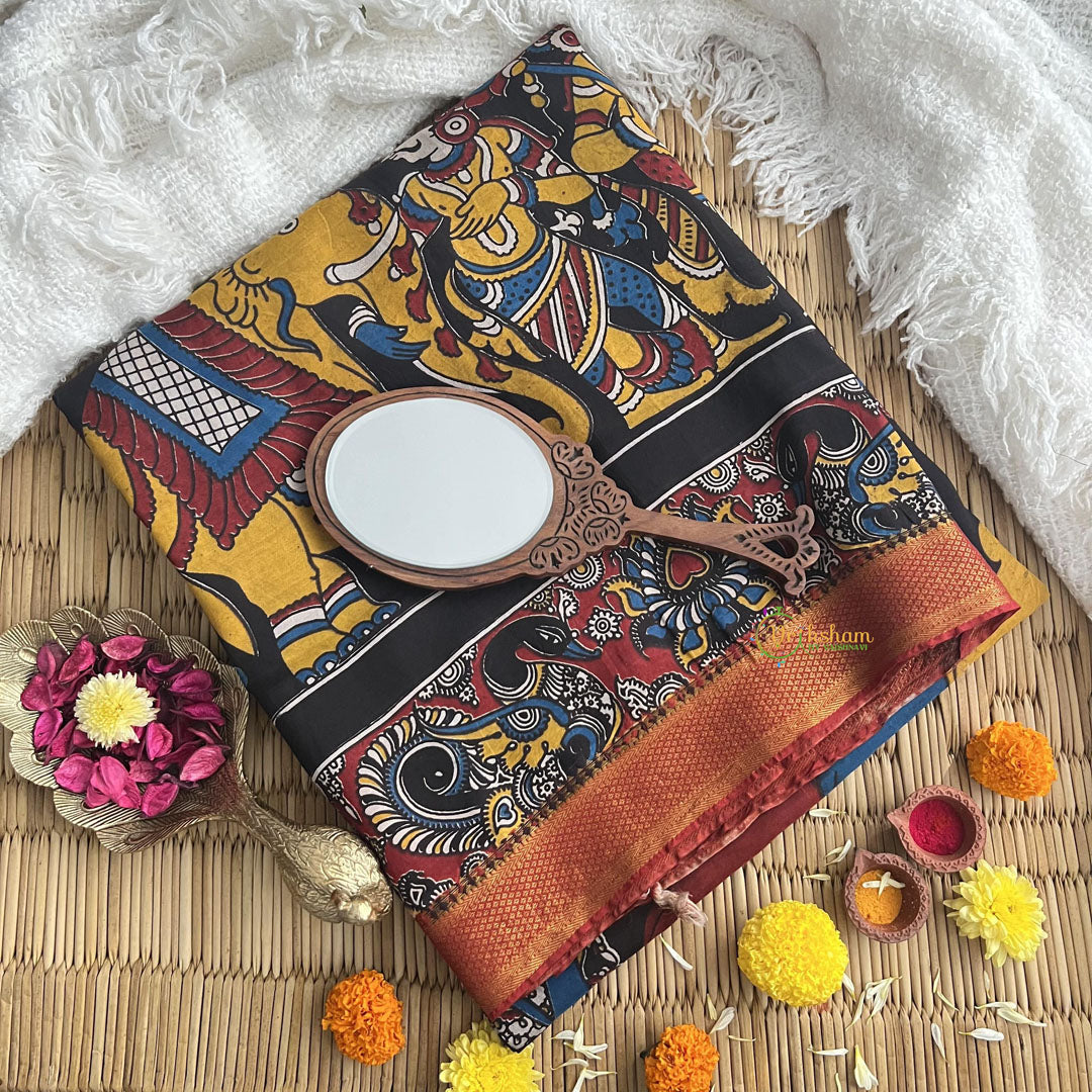 Indulge in luxury with our Black Kalamkari Saree. Made from the finest Kalamkari chiniya silk, this saree exudes elegance. Adorned with a beautiful Nizam border, it adds a touch of sophistication to your look. Elevate your style with this exclusive piece.