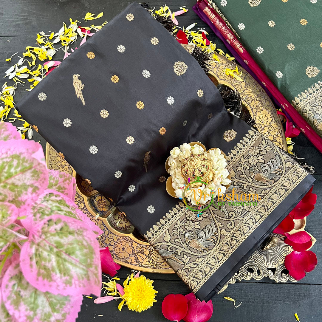 Black Semi Soft Silk Saree- Festive wear saree –Dual color Butta, peacock and parrot Pattern throughout the saree; comes with Blouse attached. Two side border and pallu.