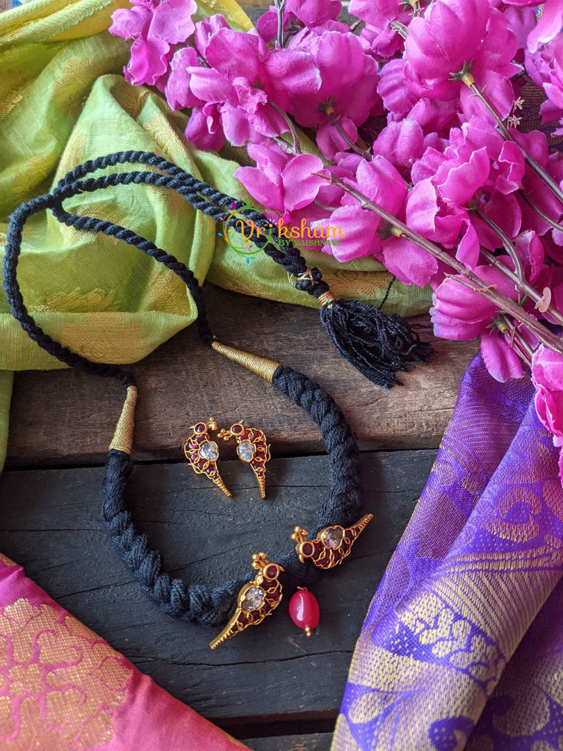 Black Thread Parrot Choker – Black braided thread choker with centre Matt twin parrot (red with white centre stone) and centre tear drop pink bead. Comes with matching ear studs.