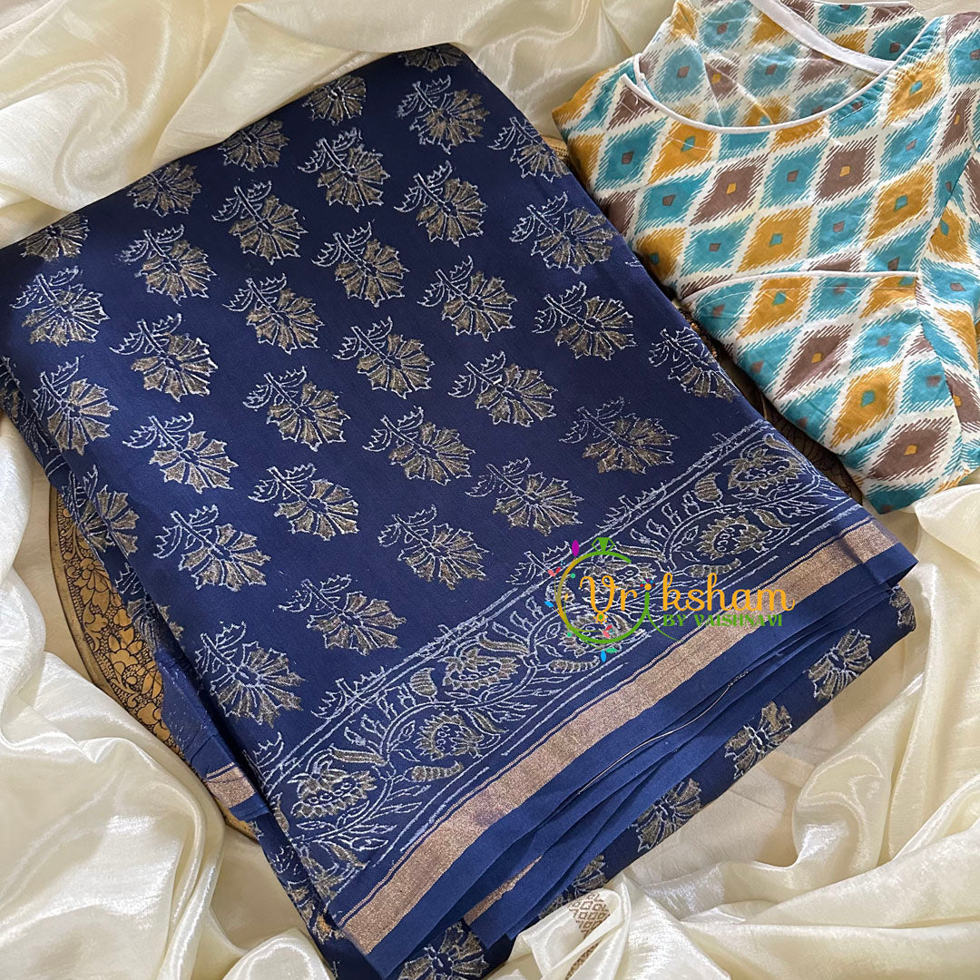 Colour and Design : Blue Chanderi Handloom Saree -Traditional Dabu hand block printing ( mud resist technique) of natural dye using hand carved wooden block for the pattern to be stamped.