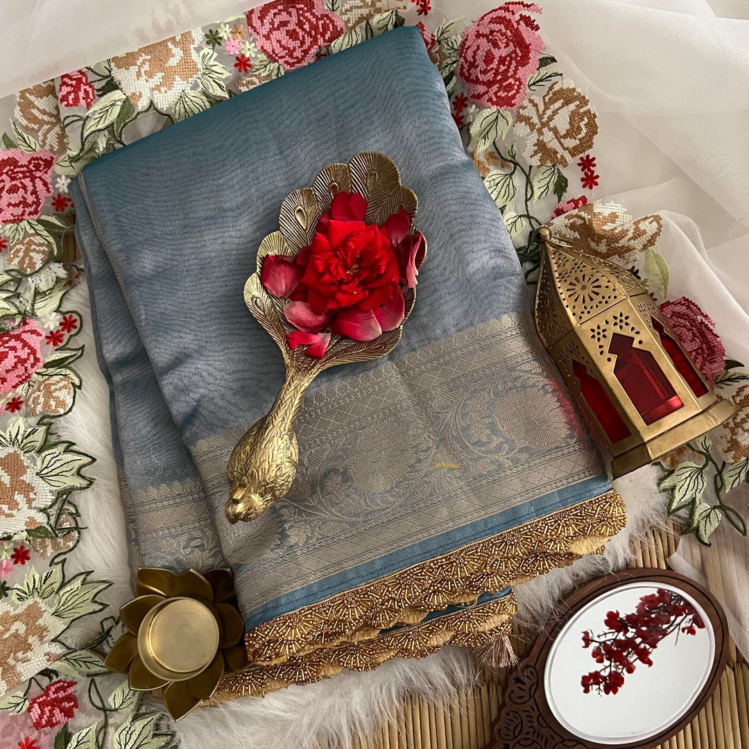 Elevate your style with the ethereal Blue Color Janhvi Kapoor's Organza Saree. Made of high-quality Shiny Kora Organza material, this handloom saree is adorned with intricate zardosi work lace and border, as seen on Janhvi Kapoor. Embrace the graceful elegance of this saree and make a statement at any occasion.