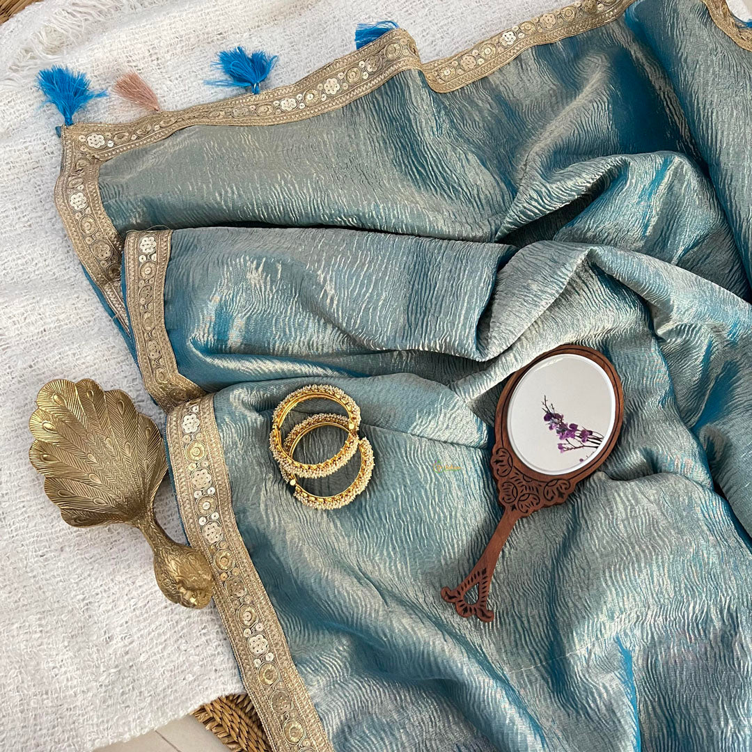Be the center of attention in our Blue Crush Organza Saree! This handloom saree features a double stunning shade and is adorned with a golden designer lace and tassels on the pallu. Stand out and make a statement with this elegant and stylish saree. Perfect for any occasion, our saree will make you feel confident and beautiful. Elevate your traditional wardrobe today!