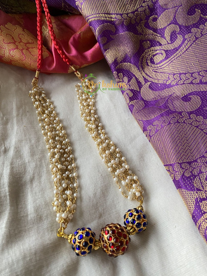 Red Blue Kemp Rudraksh Pendant Pearl Choker - 1 red and 2 blue rudraksh pendant with layers of pearl mala choker.