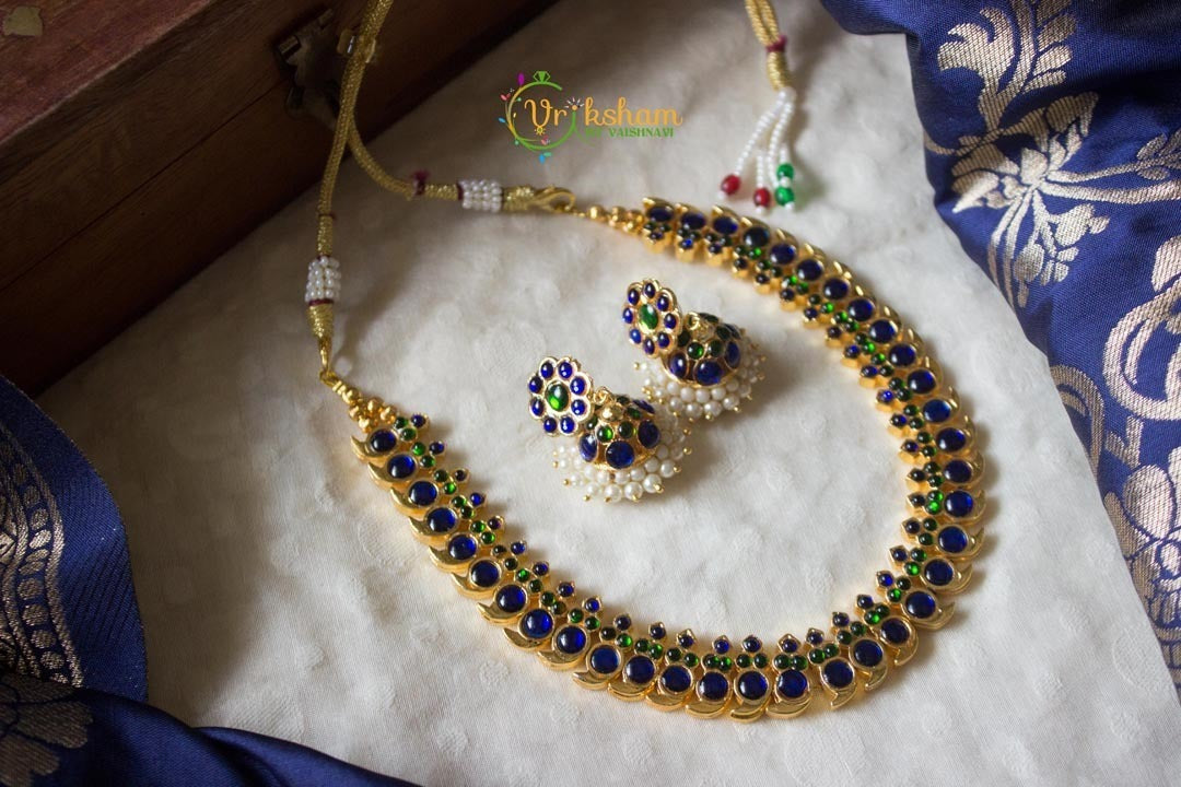 Simple kemp choker in blue and green stones with jhumkas. As already stated any design of Kemp that you require which can be handmade can be done. These are not precious Kemp stones. They are imitation. But they are handmade ?? Vriksham in an effort to support handmade jewelry has ventured into this. Looking forward for all of your support as always.