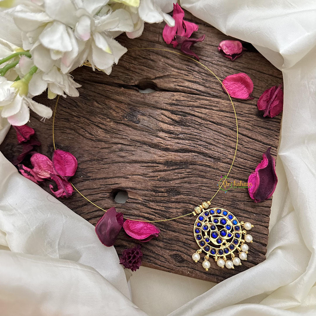 Elevate your style with our Blue Kemp Stone and Peacock Pendant Neckpiece. The regal blue kemp stone paired with the intricate peacock pendant creates a luxurious and invisible look. Stand out in any occasion with this elegant and exclusive neckpiece.