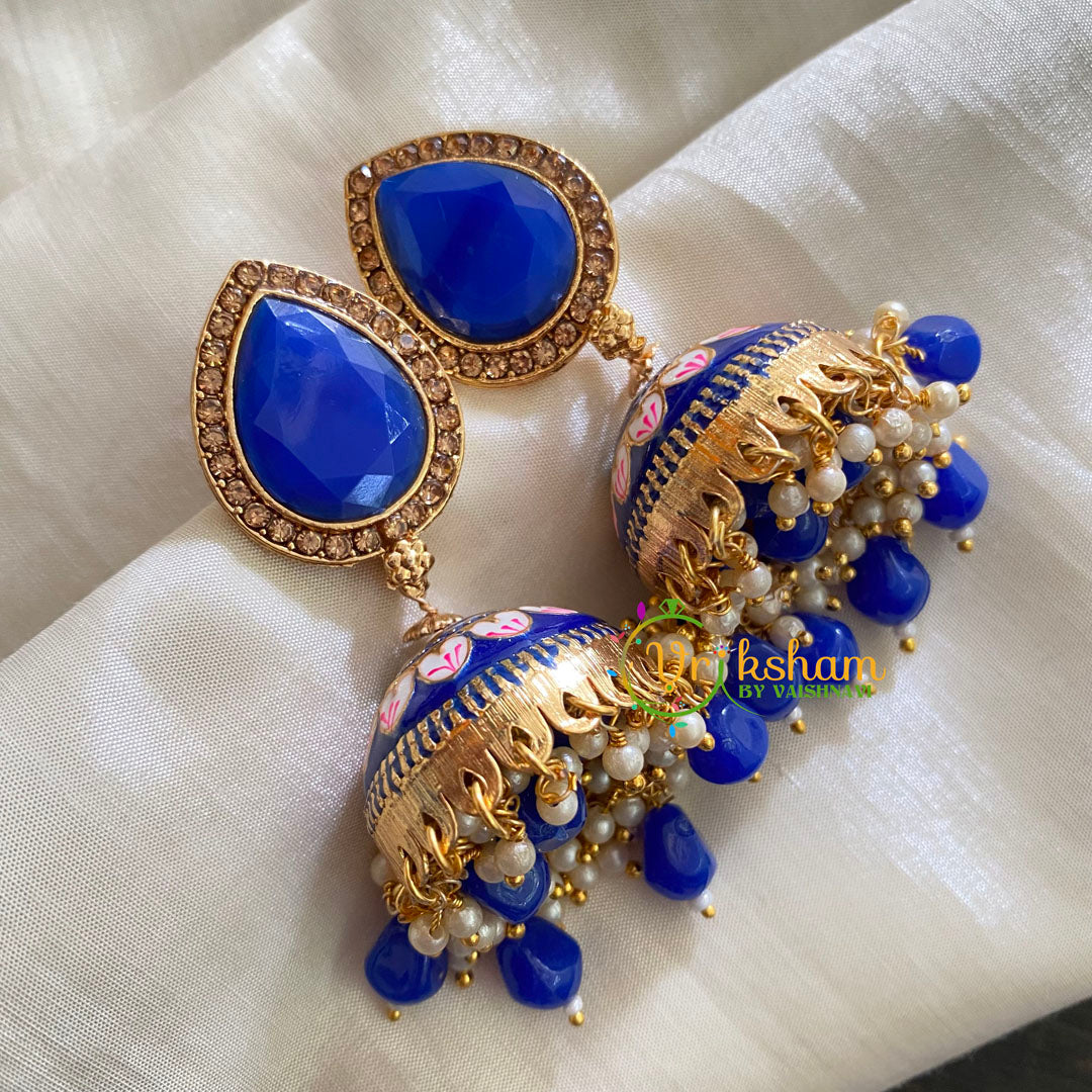 Blue Meenakari Jhumkas-Hand painted-Round Stud with hand painted Jhumkas base. Bead and Pearl finish. Medium size.