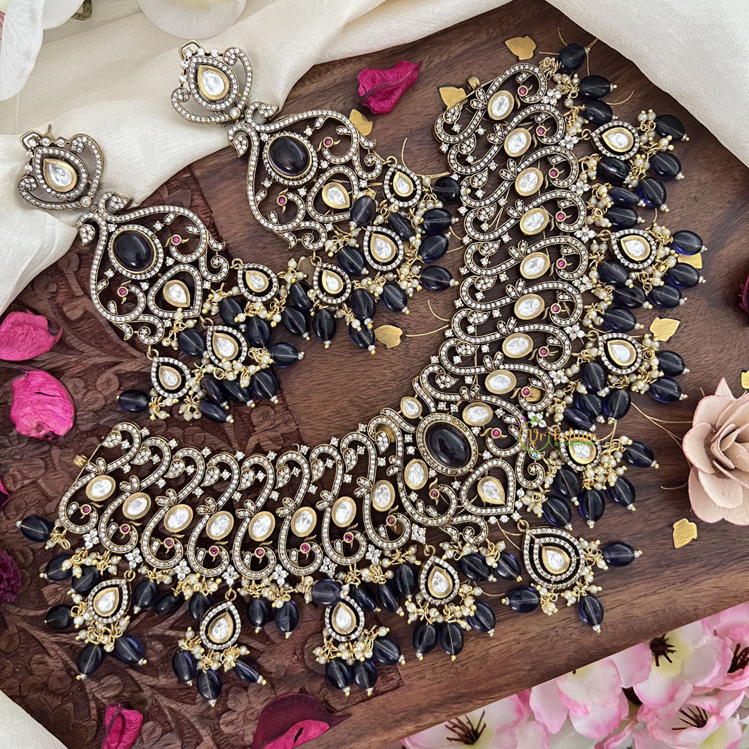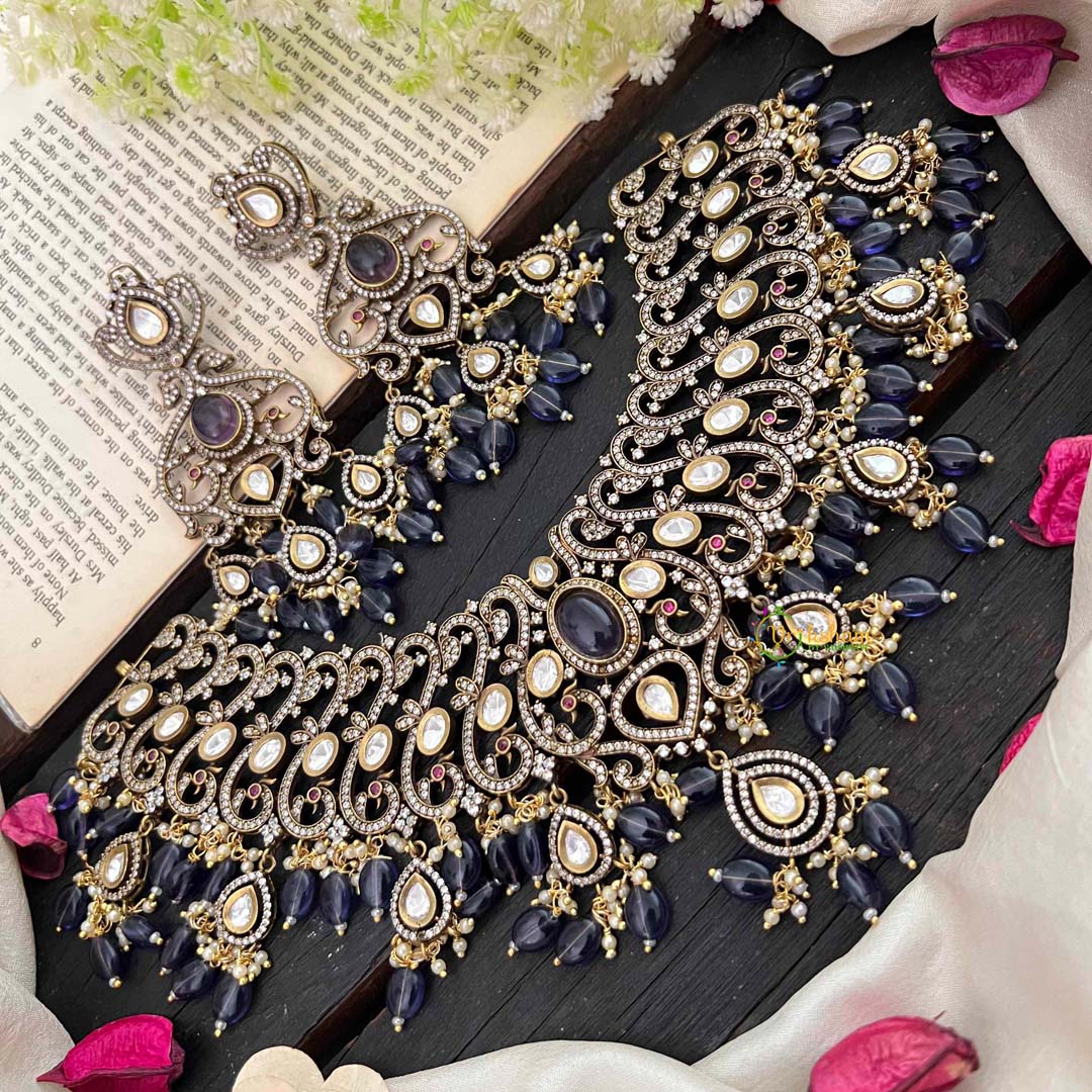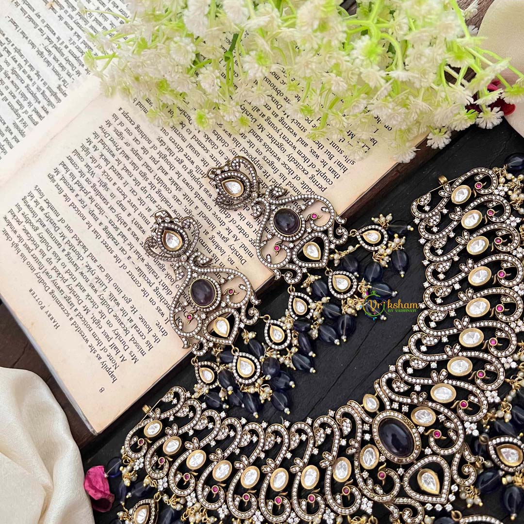 Blue Victorian Diamond High Neck Choker - precious stone studded statement royal jewelry; comes with matching earrings.