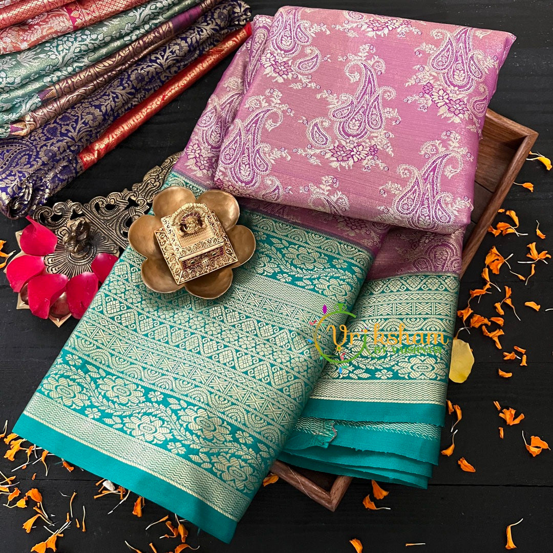 Light Pink Silk with Green Border Saree-Kanchi Silk Saree - Festive wear saree – Pattern throughout the saree; comes with Blouse attached. One side Big Border and other side lean border. Power loomed saree.