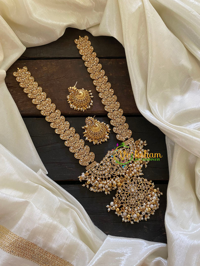 Premium Bridal AD Stone Pendant Haram - Premium quality polish long neckpiece - white stones, comes with similar matching ear hangings.