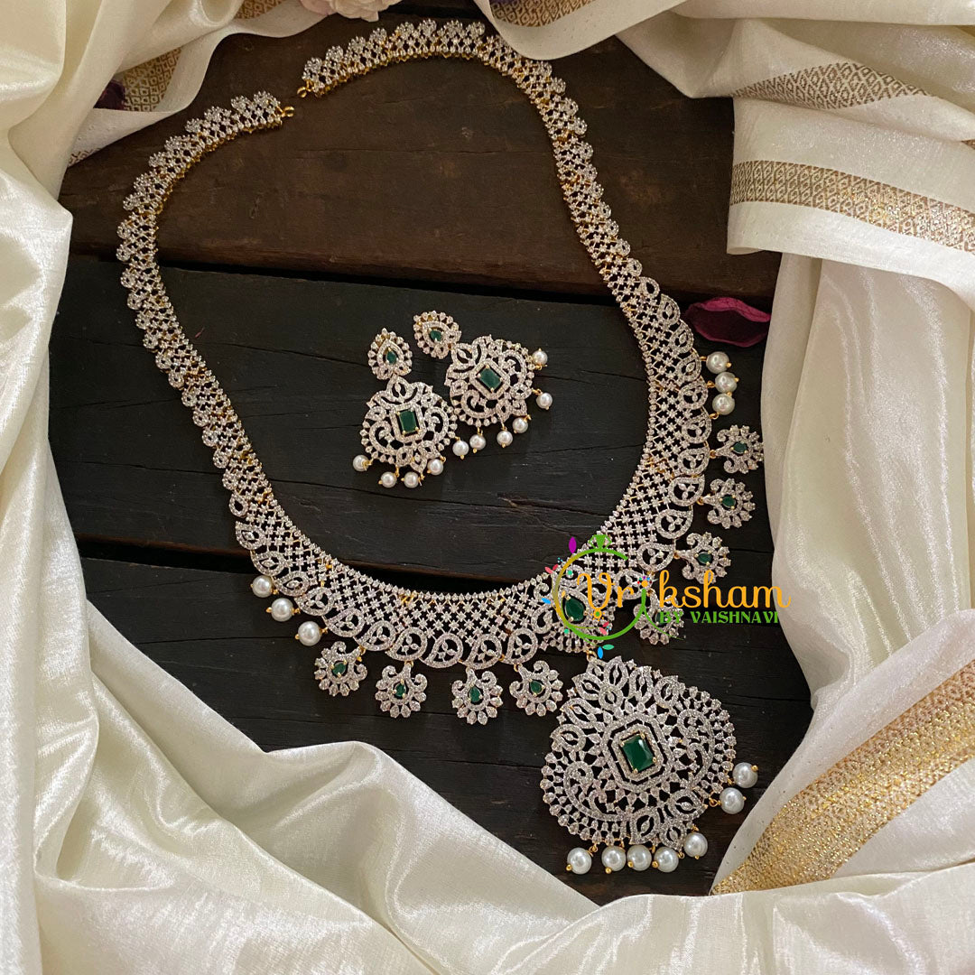 Bridal American Diamond Haram-Green-Bridal Neckpiece– with pearl finish; Green stone and matching danglers. Gold tone polish.