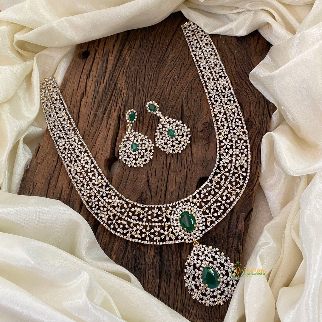 Bridal American Diamond Haram -Green stone pendant and matching earrings. Gold tone polish long neckpiece.