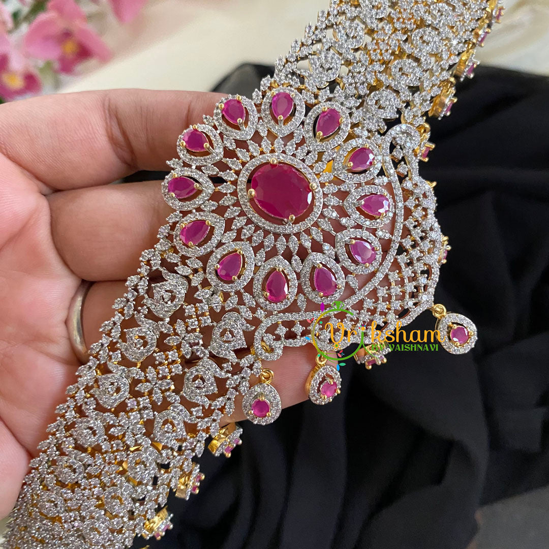Exquisite Bridal American Diamond Hipbelt -Pink Stone Oval Floral arrangment- complete white American diamond hipbelt with stone hanging finish. Made for wedding and festive occasions. Premium finish hip belt.