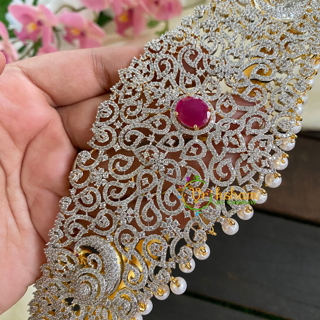 Exquisite Bridal American Diamond Hipbelt -Pink Oval Stone- Single Centre Stone complete white American diamond hipbelt with stone hanging finish. Made for wedding and festive occasions. Premium finish hip belt.