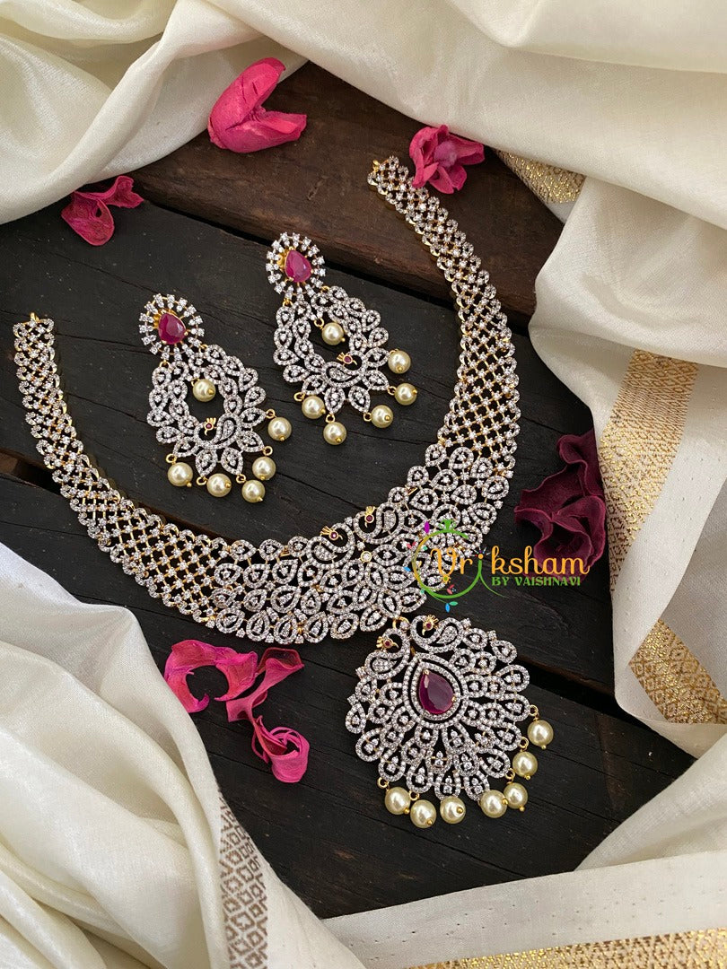Bridal American Diamond Neckpiece; centre Red stone and matching danglers.Peacock and feathers Pendant. Gold tone polish short neckpiece.