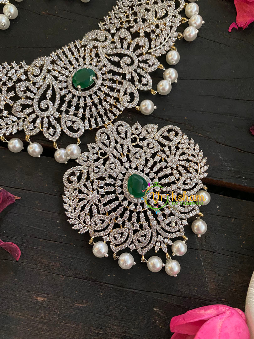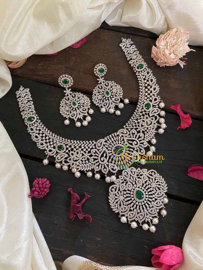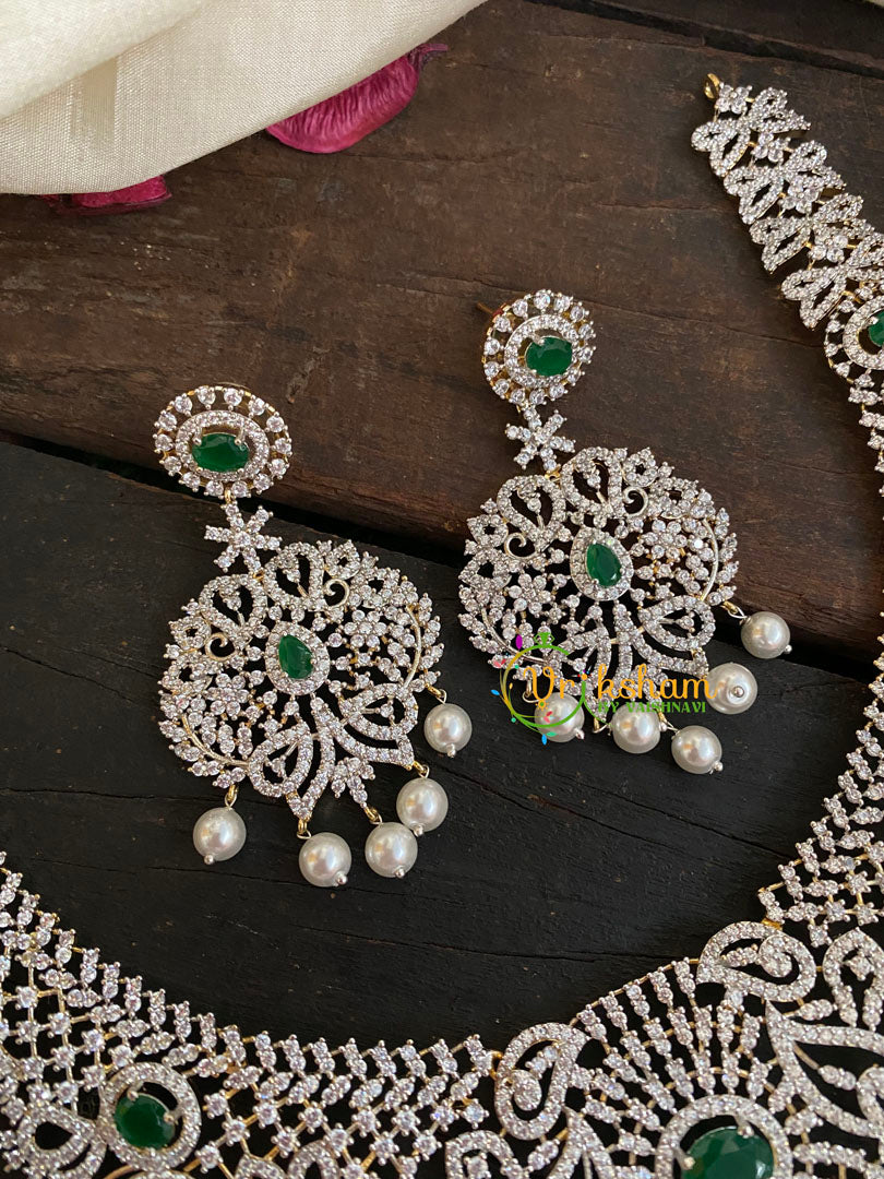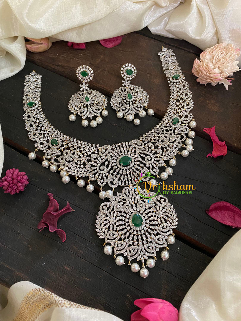 Green Stone Pendant Bridal American Diamond Neckpiece and matching danglers. Floral Pattern pendant neckpiece. Gold tone polish short neckpiece.