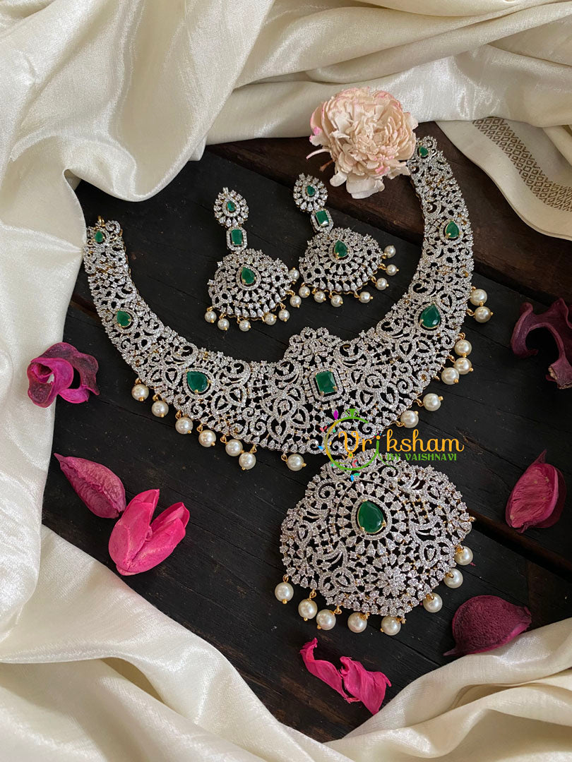 Bridal American Diamond Neckpiece- centre Green stone and matching jhumkas. Multiple stone set. Gold tone polish short neckpiece.