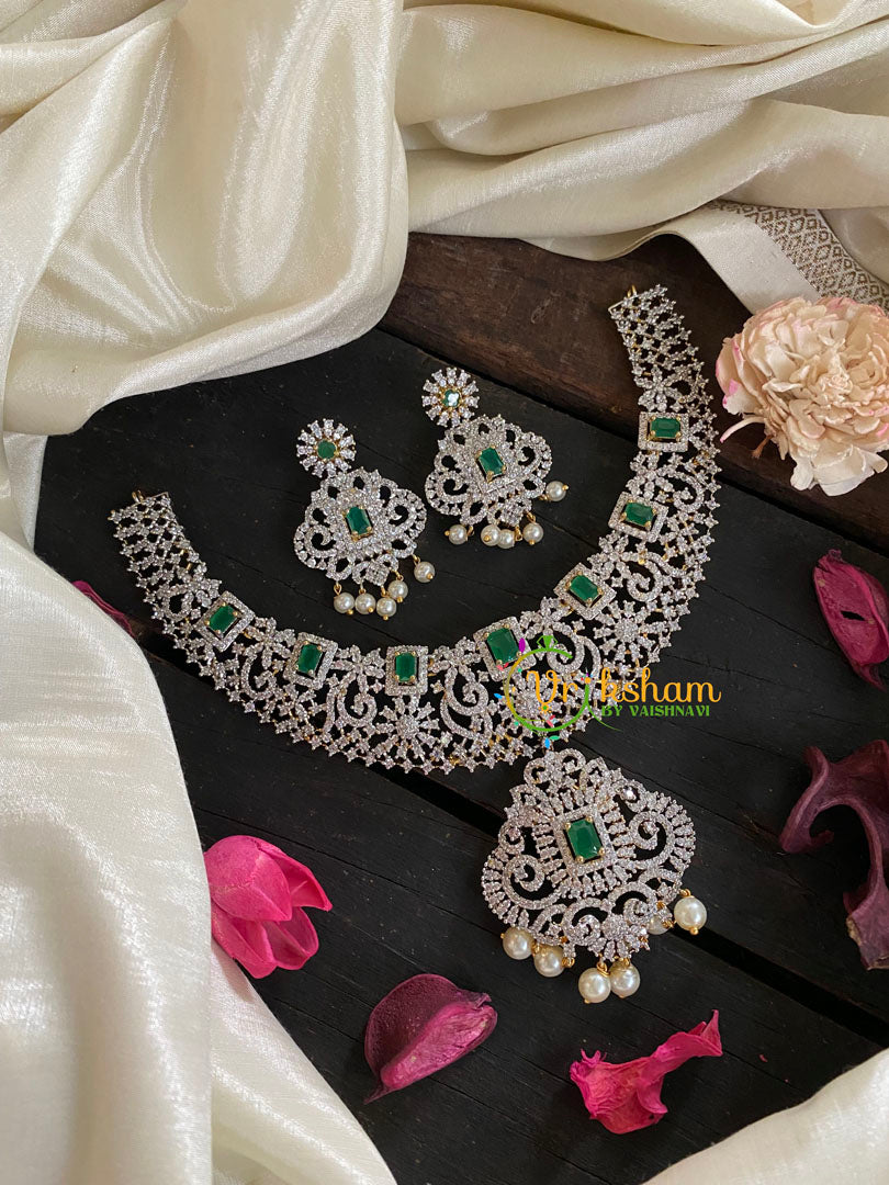 Bridal American Diamond Neckpiece-Green-Geometric centre Green stone and matching jhumkas. square stone Pendant. Gold tone polish short neckpiece.
