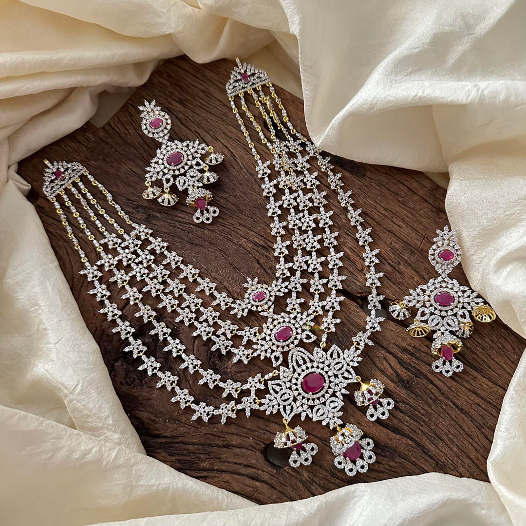 Indulge in luxury with our Bridal American Diamond Neckpiece in a striking shade of red. Featuring layered strands of American Diamonds, this glamorous piece is the perfect finishing touch for your bridal look. Complete the set with the matching earrings for a truly sophisticated and exclusive ensemble.