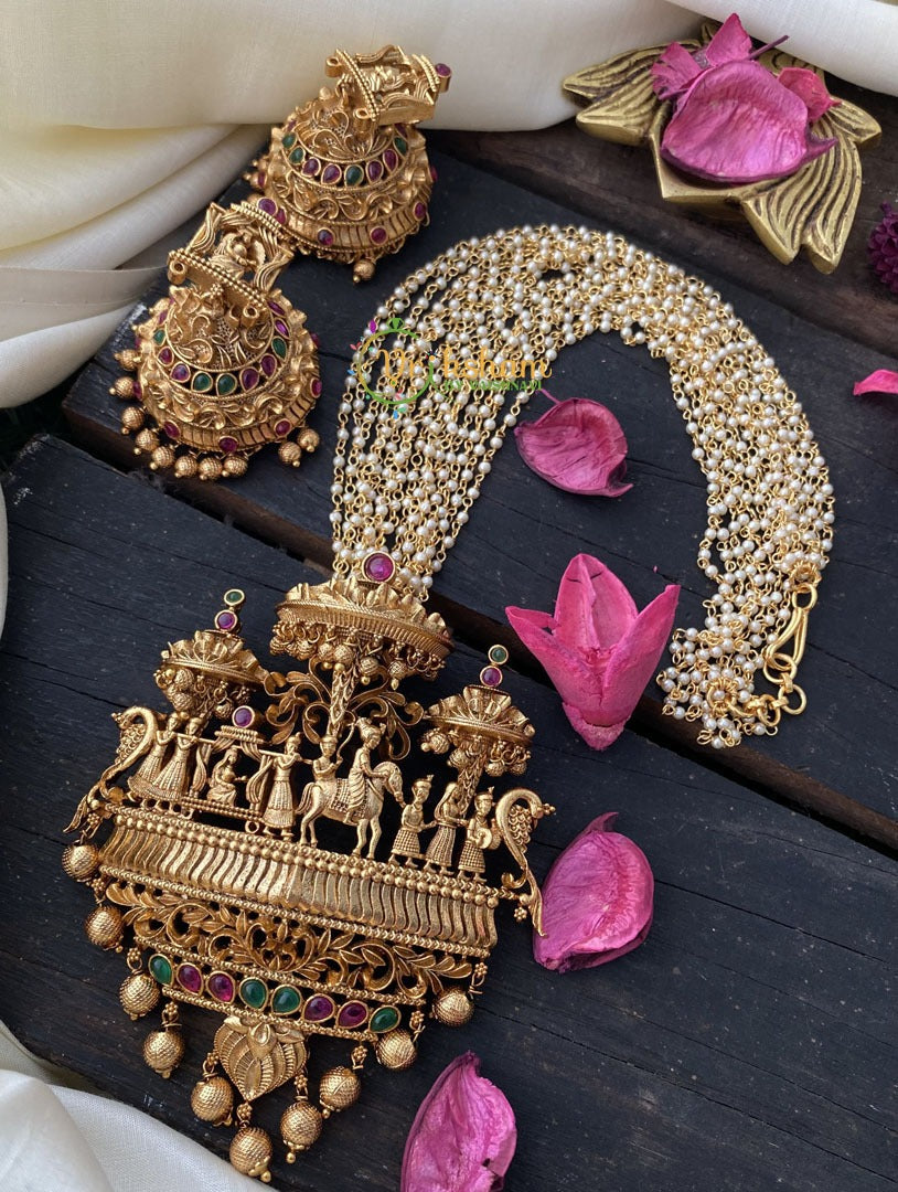 Bridal Palanquin Pendant Pearl Malai Neckpiece -Red Green -Red and green stone studded, multilayered pearl chain and pearl finish. Comes with kemp jhumkas.