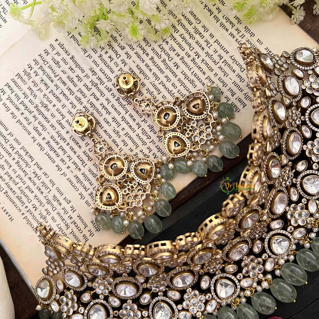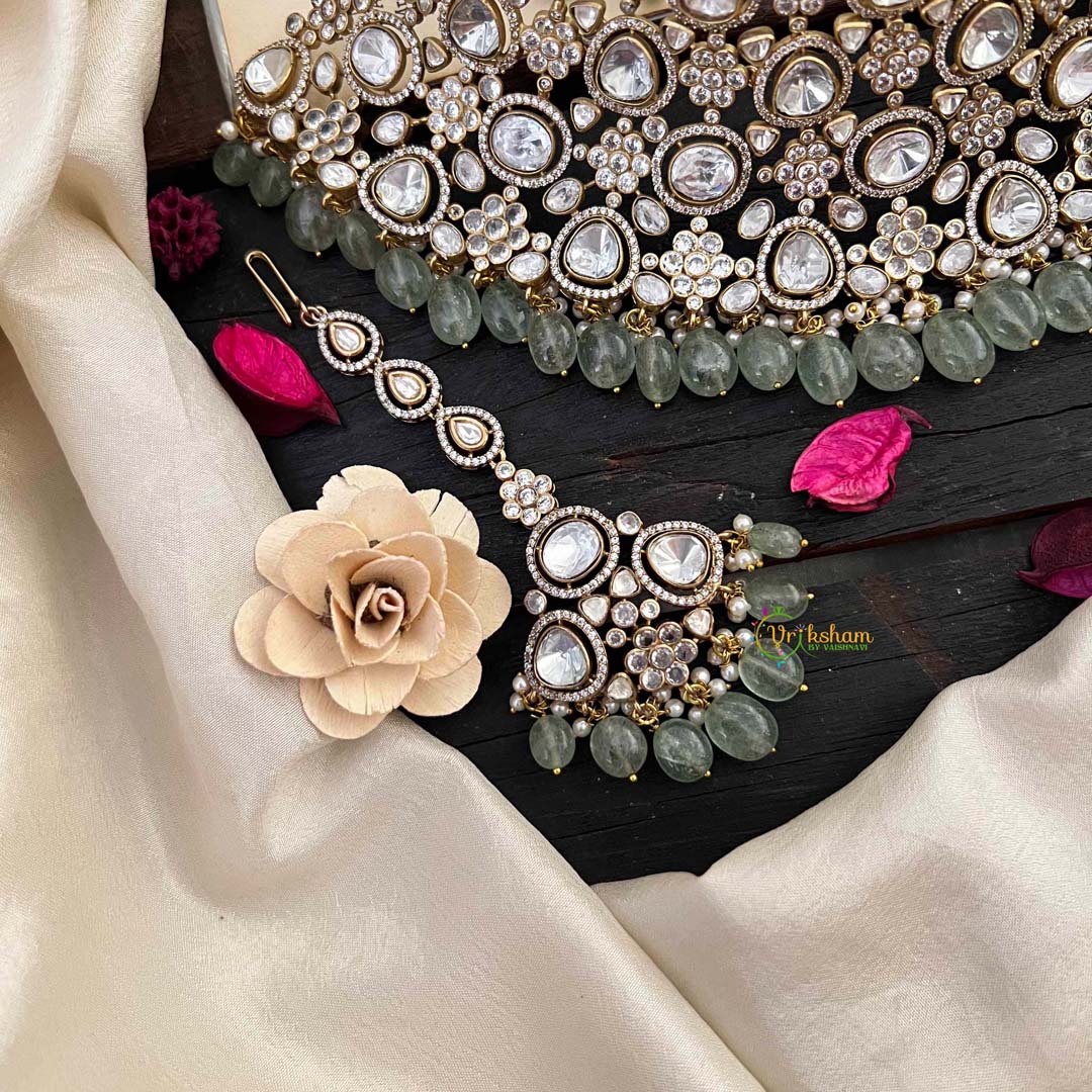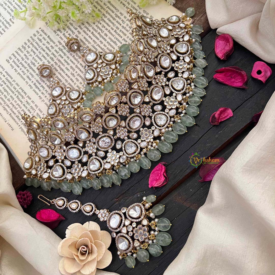 Indulge in opulence with our Bridal Statement Victorian Diamond Choker. This exquisite piece boasts a white diamond-encrusted Victorian design, adorned with aqua green beads for a touch of intrigue. Elevate your bridal look or add a touch of elegance to any ensemble.
