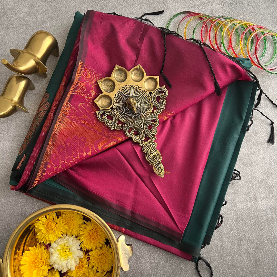 Elevate your style with the luxurious Castleton Green Soft Silk Saree. This exquisite piece features a stunning contrast pallu and delicate tassels, embellished with intricate copper zari butta. Indulge in the elegant and exclusive world of art, fashion, and literature with this premium saree.