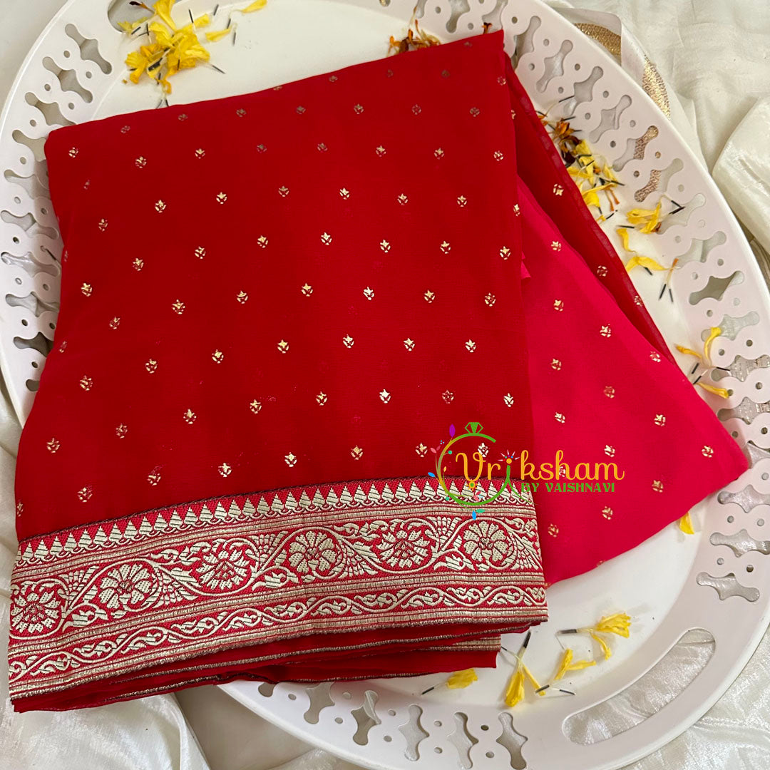 Fancy Chiffon Saree – Festive wear saree – Dotted work throughout the saree; comes with Blouse attached. Thread work two side traditional border. Patch worked saree with separate blouse.
