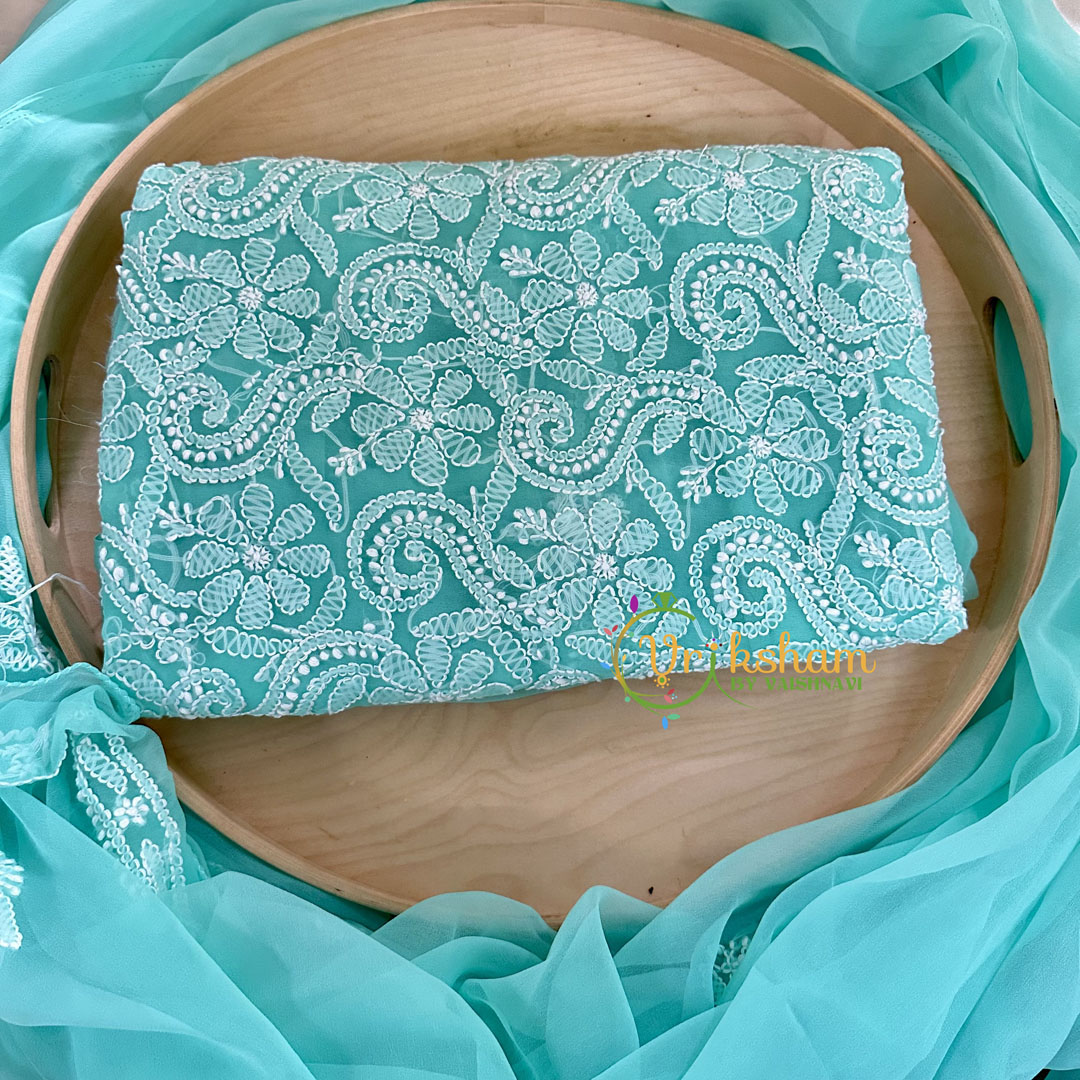 Aqua Green Blue Chikankari Suit Material Set -Salwar kameez material set – comes as whole material top, bottom and shawl. Handloom Chikankari suit set.