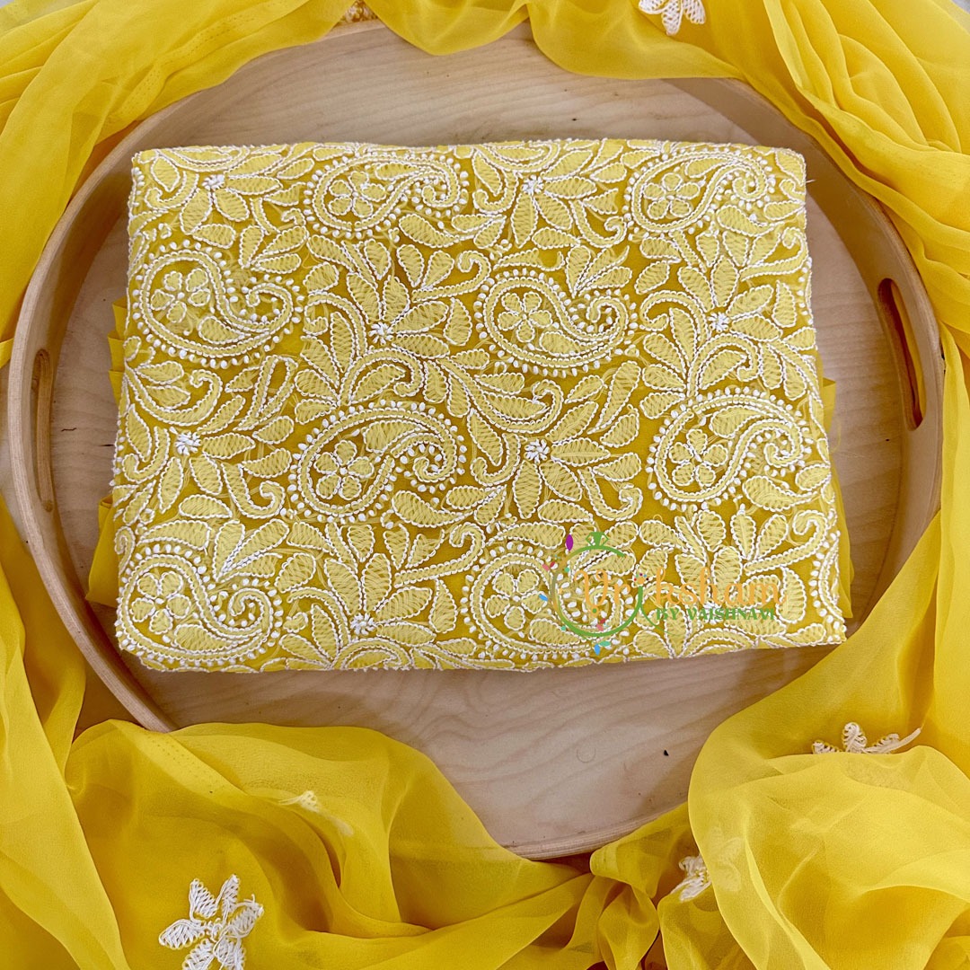 Yellow Chikankari Suit Material Set -Salwar kameez material set – comes as whole material top, bottom and shawl. Handloom Chikankari suit set.