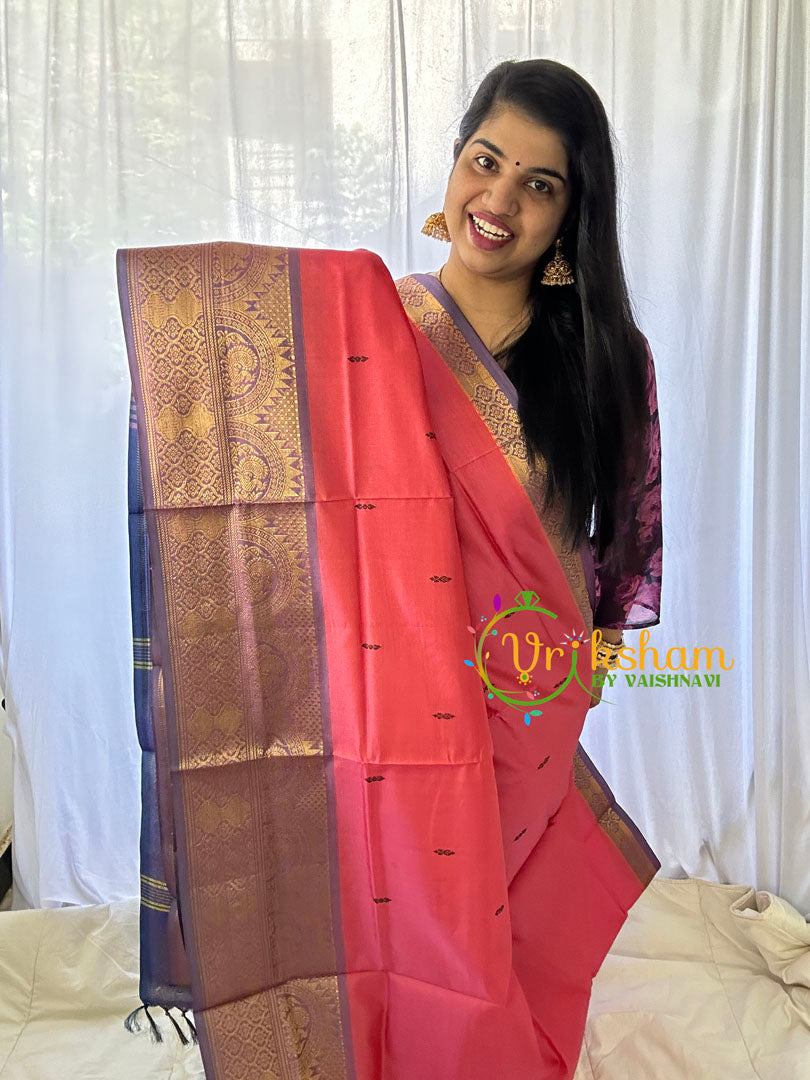 Pinkish Red Chinnalampattu Saree with grey blue pallu - Banana pith vegan silk saree handcrafted elegant festive wear saree; unique kanchi border and pallu. Doesn't come with blouse -Saree only.
