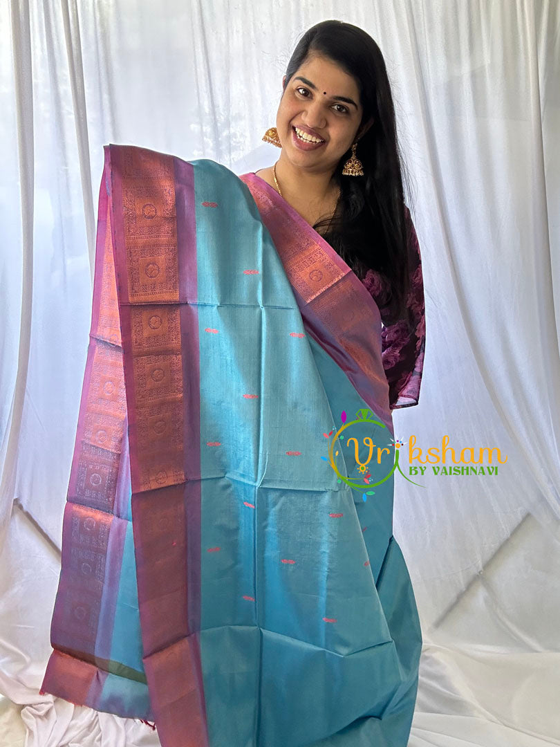Light Blue Chinnalampattu Saree with pink red pallu - Banana pith vegan silk saree handcrafted elegant festive wear saree; unique kanchi border and pallu. Doesn't come with blouse -Saree only.