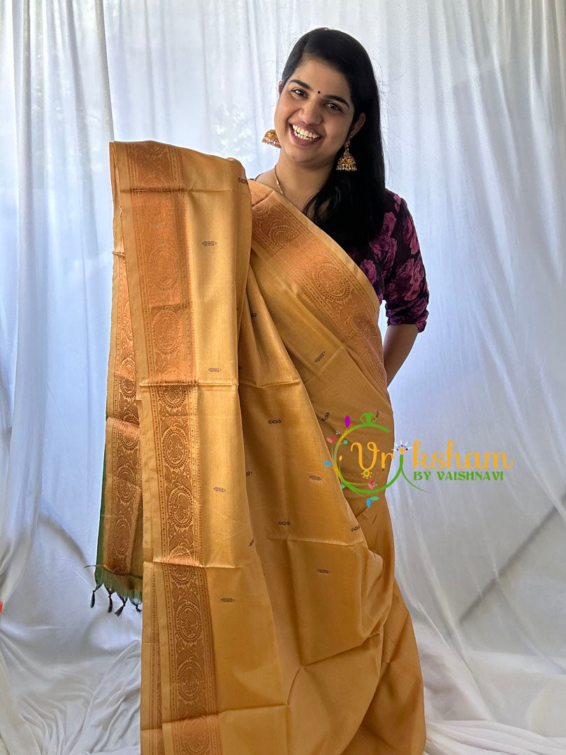 Beige Chinnalampattu Saree with light green pallu- Banana pith vegan silk saree handcrafted elegant festive wear saree; unique kanchi border and pallu. Doesn't come with blouse -Saree only.