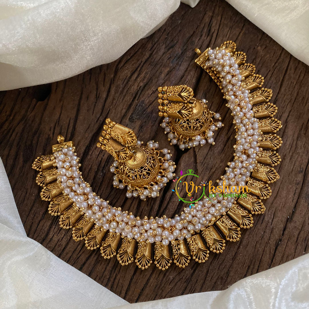 Cluster Pearl Choker Short Neckpiece - NO stone neckpiece - premium gold alike polish and finish choker/short neckpiece; come with earrings.