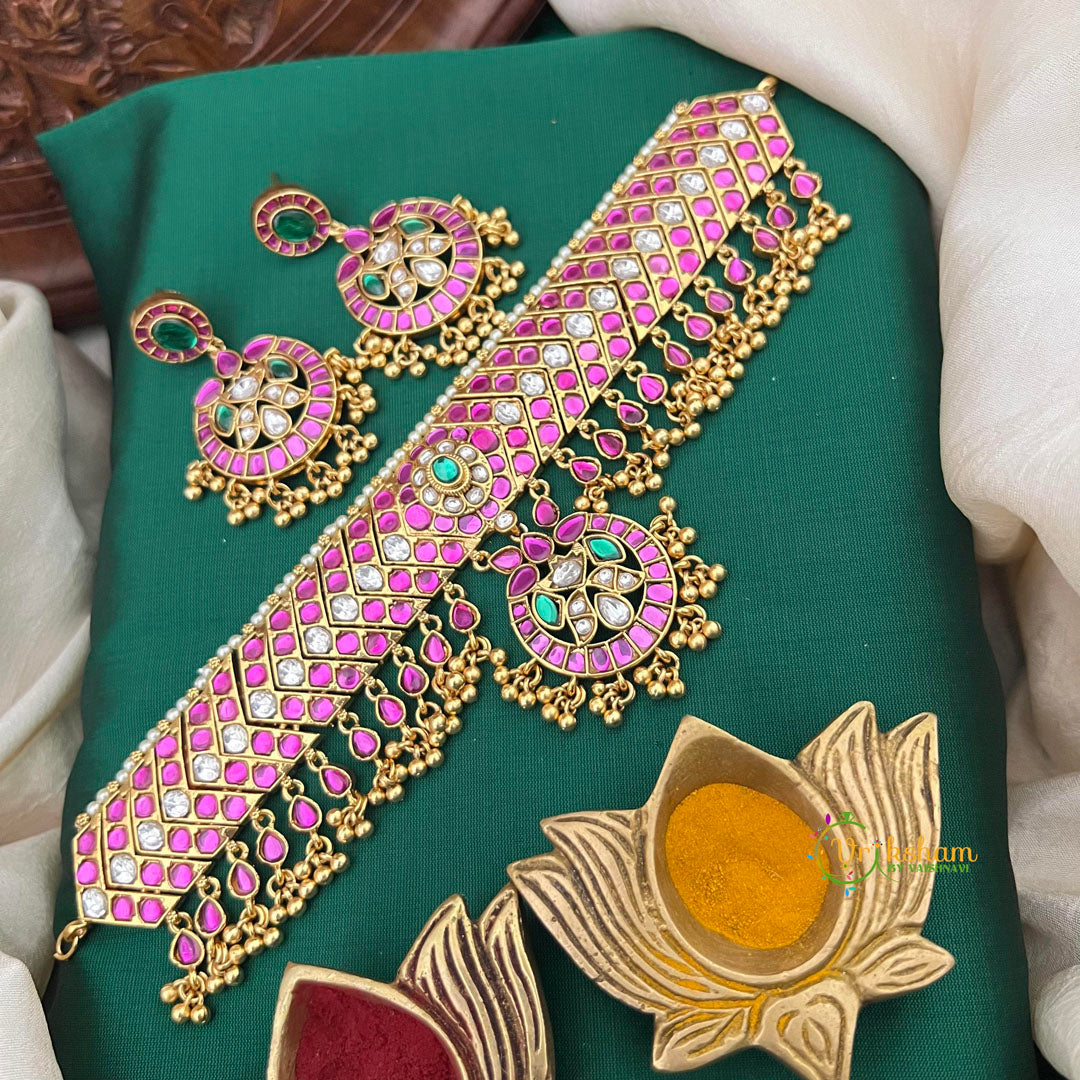 Elevate your festive look with this Classic White Red Green Stone Half Moon Style Choker, a stunning blend of traditional craftsmanship and contemporary design. Each piece is meticulously created using authentic Kundan Jadau techniques, where precious white, red, and green stones are hand-set without adhesive for exceptional durability and lasting brilliance. The distinctive half-moon silhouette serves as a sophisticated focal point, making it ideal for weddings, festivals, and special celebrations. The warm gold-alike finish beautifully complements the vibrant gemstones, creating a versatile statement piece that shines beautifully on its own or layered with complementary jewelry. Handcrafted with generations of South Indian artistry and cultural heritage, this choker is a treasured addition to any jewelry collection.