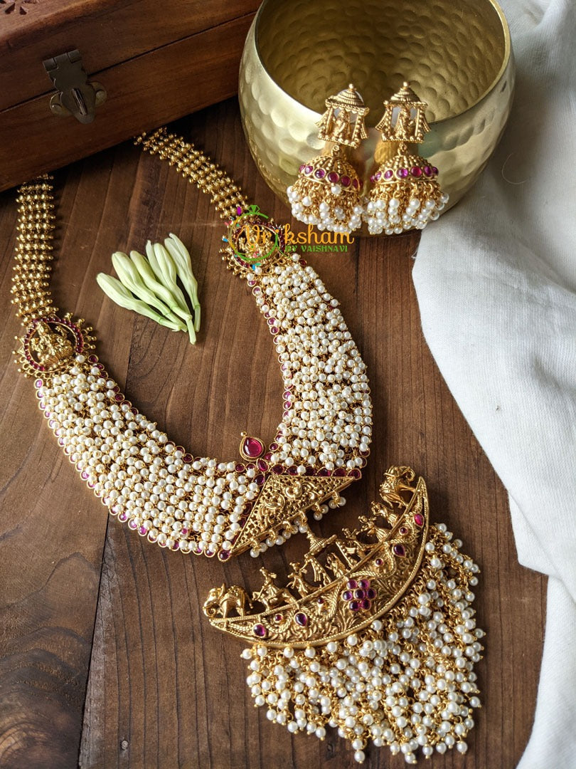 Premium Cluster Pearl Bridal Palanquin Haram -Layer of cluster pearls with Lakshmi mogappu and red stones and hanging pearls, comes with matching ear hangings.
