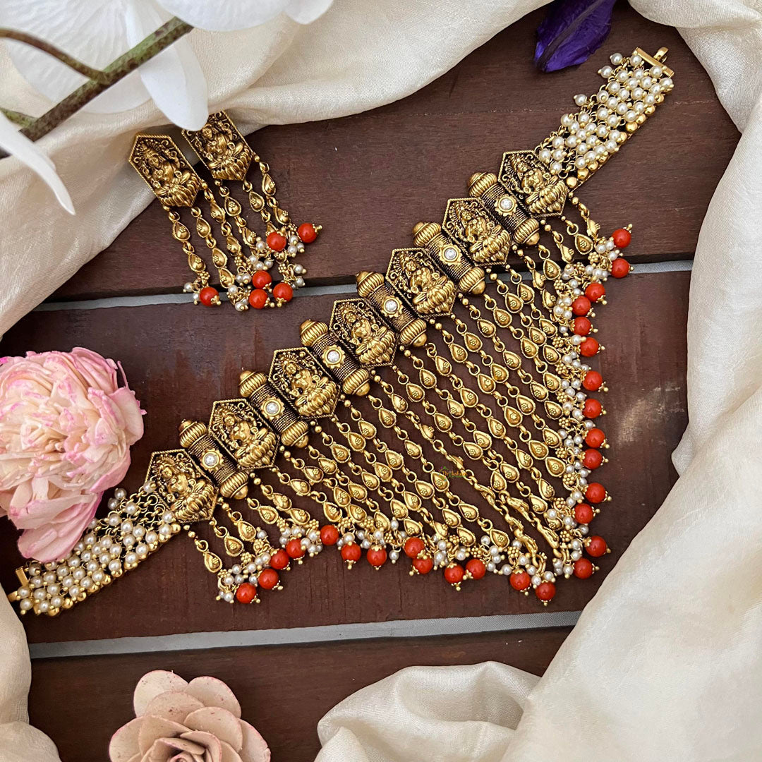 Embrace the opulence of our Gold Look Alike Lakshmi High Neck Choker. Made with luxurious gold beads, this choker is elegantly adorned with the goddess Lakshmi, known for bringing good luck and prosperity. Exude grace and sophistication with this exclusive piece.