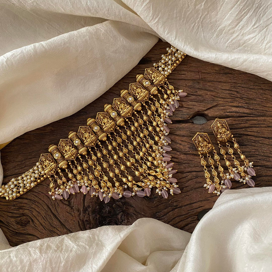 Cluster Pearl Kerala Style Lakshmi High Neck Choker-Gold Bead -Temple Choker - White AD stone studded centre layer of Lakshmi idol and layered chains premium quality high neck choker; Pastel Pink bead finish. Temple make look. Comes with matching earrings.