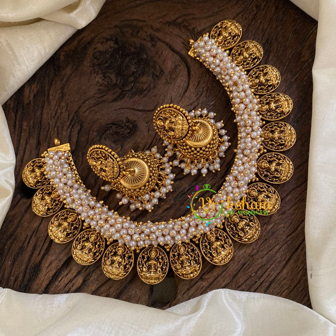 Cluster Pearl Laskhmi Coin Choker - NO stone studded premium gold alike polish and finish choker/short neckpiece; come with earrings.