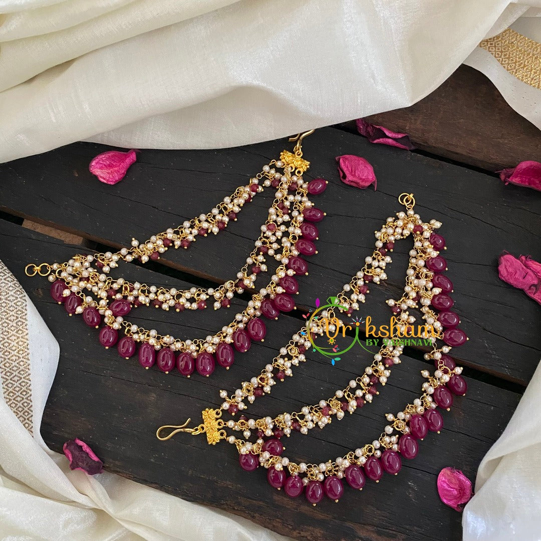 Cluster Pearl and Red Bead Maatil -3 layered red imitation beads hanging ear chain.
