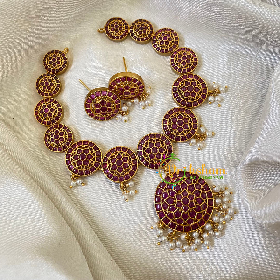 Coin Style Neckpiece with Pendant-Red -round–Premium matt polish coin style, red stone Comes with Matching Stud.