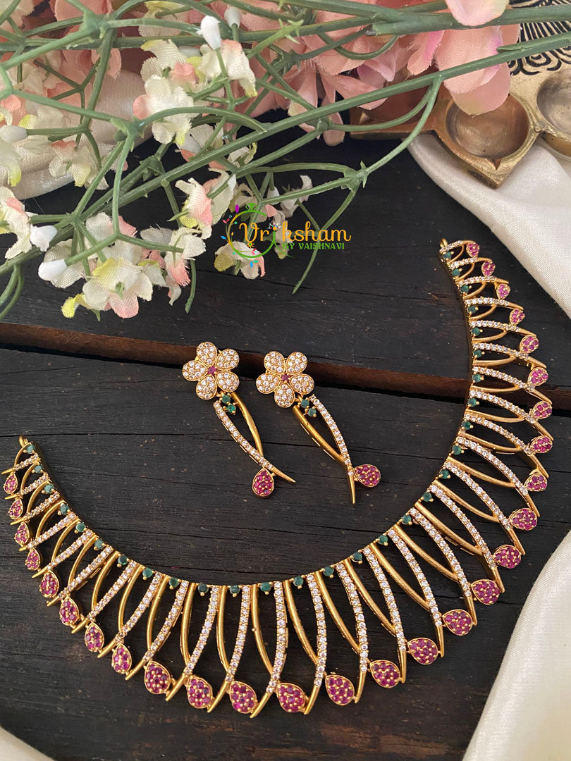 Red Green White CZ Stone Choker Neckpiece - Comet shaped with Pattern , comes with matching danglers.